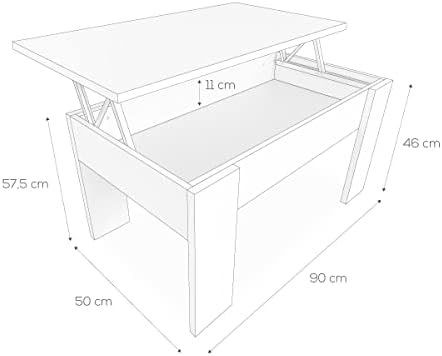 Table d'appoint pour le salon ou la salle à manger, qui s'intègre parfaitement dans tout environnement, grâce à son design scandinave exclusif. La table fermée mesure : 90 cm (largeur) x 50 cm (profondeur) x 46 cm (hauteur) ; la table relevée mesure : 90 cm (largeur) x 50 cm (profondeur) x 57 cm (hauteur). Ses glissières métalliques vous permettent d'actionner facilement l'élévation de la table. La table basse relevable Mattfy est une table basse pratique pour le salon/salle à manger dont la surface se relève, ce qui vous permet de manger, de boire du thé ou du café, de lire ou de travailler plus facilement depuis le canapé, grâce à son mécanisme de levage fiable. Avec un design attrayant, c'est une table très fonctionnelle, adaptée aux besoins d'aujourd'hui. Ses finitions peuvent être combinées avec tous les types de meubles et de styles. De plus, grâce à son compartiment intérieur, vous pouvez y ranger des objets. La table est fabriquée en mélamine de haute qualité et imperméable à l'eau, d'une grande durabilité. Ce type de matériau présente une surface non poreuse et très résistante, ce qui permet de la nettoyer facilement et rapidement à l'aide d'un chiffon humide. Produit fabriqué de manière durable en Espagne. Assemblage facile (il comprend des instructions claires et simples, ainsi qu'un tutoriel vidéo d'assemblage que vous trouverez dans la section photo du produit). Pour l'assembler, vous avez besoin d'une clé Allen (incluse), d'un tournevis Phillips (non inclus) et d'un petit marteau ou d'un mini maillet (non inclus).